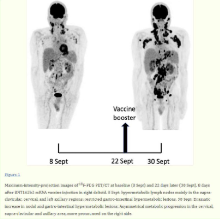 Die Abbildung zeigt die explosionsartige Vermehrung von Krebs-Metastasen des lymphatischen Systems innerhalb von nur 22 Tagen, nachdem die dritte ("Booster") Impfung verabreicht worden war. Die ersten beiden "Impfungen" hatte der 66-Jährige sechs, bzw. fünf Monate zuvor bekommen. Damals hatte er noch nicht Krebs, oder dieser war noch nicht entdeckt. Es darf darüber spekuliert werden, ob die "Impfungen" den Lymphdrüsenkrebs ausgelöst haben. Quelle
