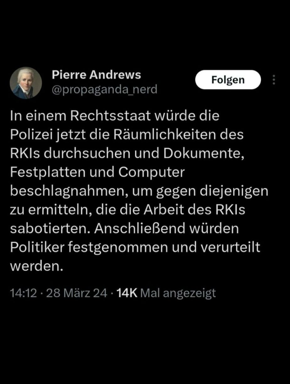 RKI-Files oder "der Tag, der Deutschland für immer veränderte." Die Dokumentensammlung ist hier (oder hier) zu finden und wurde zuvor vom Multipolar-Magazin freigeklagt und veröffentlicht. Kurz zusammengefasst war die geringe Covid-Gefahr bekannt, wurde allerdings auf politische Anweisung höher bewertet, es wurden schwere Impfnebenwirkungen erwartet und man wusste, dass der Lockdown bzw. Masken keinen Sinn machen. Sie könnten "das wichtigste historische Dokument unserer Zeit sein" und sie sind die Sprengladung , die das gesamte „Corona“-Narrativ endgültig zum Einsturz bringen wird. Quelle