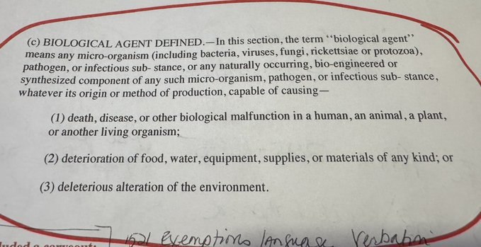 Die Ausnahmeklausel in 50 USC, die es der US-Regierung/dem Verteidigungsministerium ERLAUBT, CHEMTRAIL-VERBOTE DER BUNDESTAATEN AUSZUSCHALTEN, listet tatsächlich auf, was sie auf euch abwerfen dürfen ... Bakterien, Viren, Pilze, Rickettsien/Protozoen (Parasiten), einschließlich biotechnologisch hergestellter Mikro-Krankheitserreger ..."